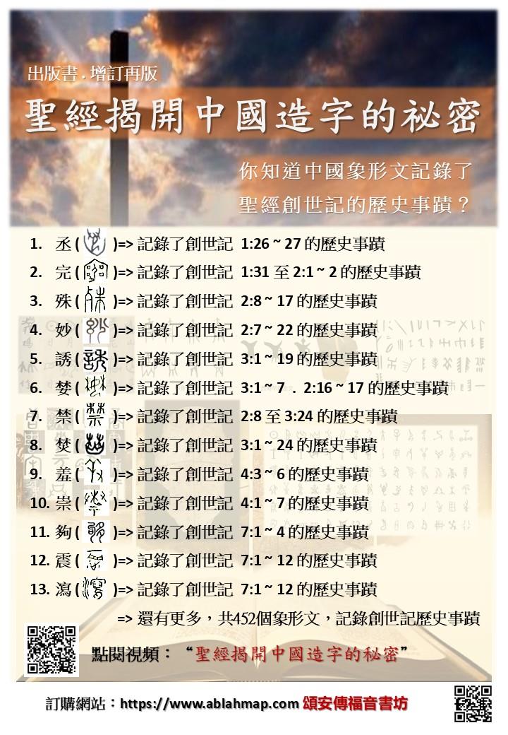 ● 這本著作很適合當代的“學者”、“學子”、“知識份子”、“政府教育部官員”、“全世界華人”,當然也適合基督教會的“傳道人”、“基督徒”,使世界大眾都知道,「中國象形文的造字根據是來自《聖經˙創世記》」,以此讓世人知道,耶和華上帝是造天地與其中所充滿一切的造物主,更是人類的「祖」。 ● 本著作相當不同於「古今」的「說文解字」學者之見解,他們對文字學的解析、認定,都是根據自己的「自由心證」,並沒上古歷史事蹟的根據,對於他們所解析出的「字義」實有瑕疵,當然也就得不著歷史的教訓了。 ● 文字是「凝固的歷史」,是不變的,但古今說文解字者,因年代的淺近,固然不知遠古之歷史事蹟,實在不能苛責,雖然對文字學的貢獻值得敬佩,但卻是不發明上古歷史的真相記錄。所幸在遺憾中,卻有了本著作──《聖經揭開中國造字的祕密》一書,發明了原來中國的造字是根據《聖經˙創世記》第一章至第十一章中段的上古歷史事蹟──“全世界人類共同的祖先與耶和華上帝互動的歷史事蹟”所造的文字。 ● 本著作開發中國文字學、聲韻學、方言文學及訓詁學的研究新路線。有益於當今華人學者的再研究,再發現更多的「文字」,豐富中國文字的內涵與博大精深。 ● 本著作從「象形、會意、指事、形聲」配合《聖經˙創世記》,解析了四百五十二個字,其解析不同於古今《說文解字》學者。中國造字的根據,就在《聖經˙創世記》中被解開了! ● 中國文字記錄了《聖經˙創世記》的人類遠古歷史事蹟──與上帝的互動情形,所以確定華人不是「龍的傳人」,而是「耶和華的傳人」,是信耶穌拜上帝的民族! ● 本著作有益於天文學者、地球物理學者、人類學學者等,研究「挪亞」大洪水前後的人類壽命與地球變化。 ● 本著作將引動語言學者,研究人類最起初共同語言的興趣。 ● 本著作亦適合基督徒一對一的傳福音,在聊天中,見證「華人」就是耶和華的傳人,原本就是「信耶穌拜上帝的民族」。 -- 【目錄分享】 目錄 字目錄 注音目錄 序言 鄭序 自序一 自序二 前言 人類共同祖先年代表 第一章 信仰篇 第二章 根據篇 壹、聖經·創世記第一章 貳、聖經·創世記第二章 參、聖經·創世記第三章 肆、聖經·創世記第四章 伍、聖經·創世記第五章 陸、聖經·創世記第六章 柒、聖經·創世記第七章 捌、聖經·創世記第八章 玖、聖經·創世記第九章 壹拾、聖經·創世記第十章 壹拾壹、聖經·創世記第十一章 第三章 最後的話 . . . (閱讀更多,請見實體書)